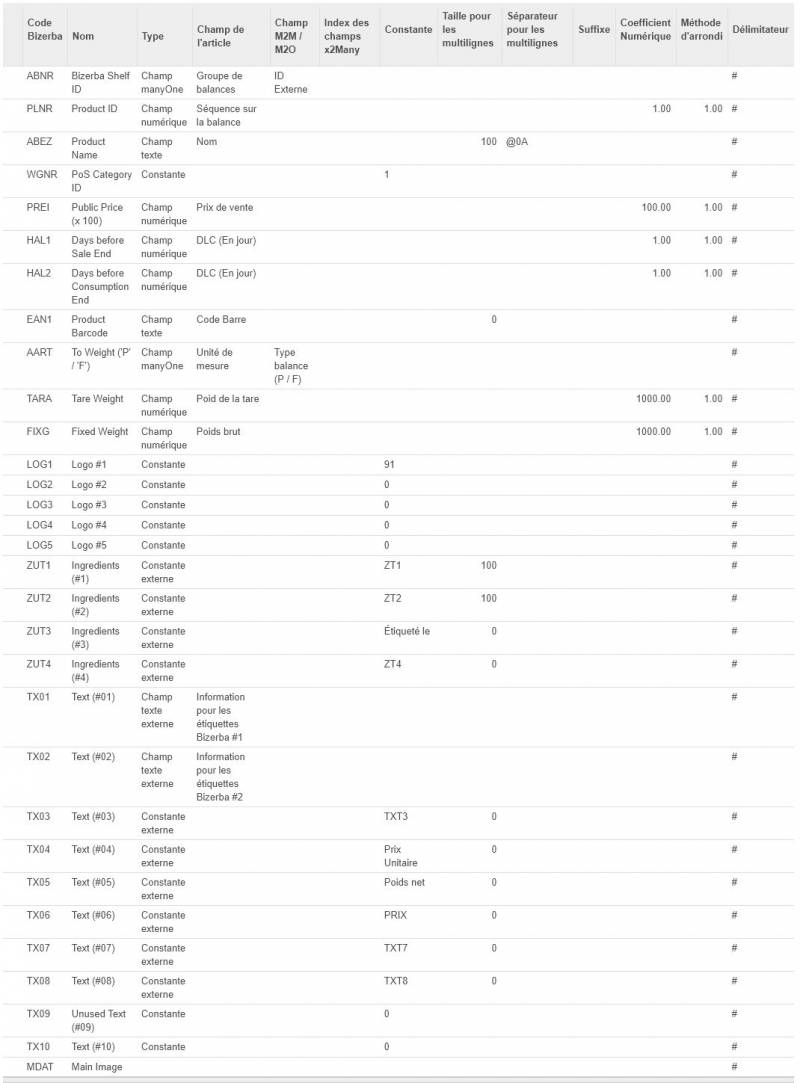 MDAT (Main image) : ne pas mettre d'image ! Si la balance n'a pas d'images imprimées au niveau des touches (cas de notre premiere balance). Cela remplirait la memoire sans jamais la vider car la balance ne consomme pas les images poussées systématiquement pas les scripts coté serveur de balance (ces scripts ne gerent pas le cas de balances sans image sur les touches). Indiquer dans le fichier de config xml que notre balance n'a pas d'image article n'est pas une solution car le script ne sait pas le prendre en compte et du coup n'envoie rien du tout. (update de script Bizerba necessaire). Laisser ce champ vide.